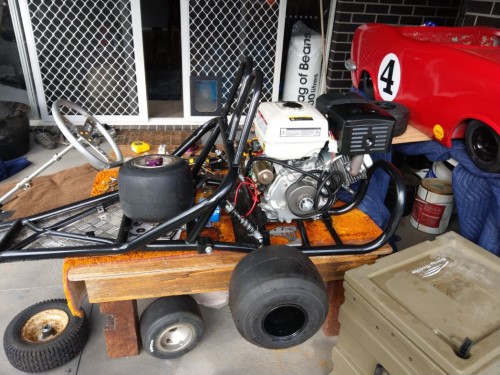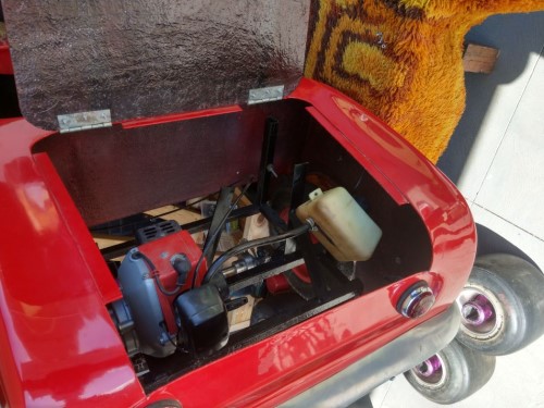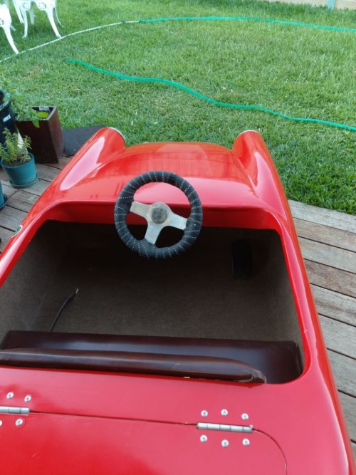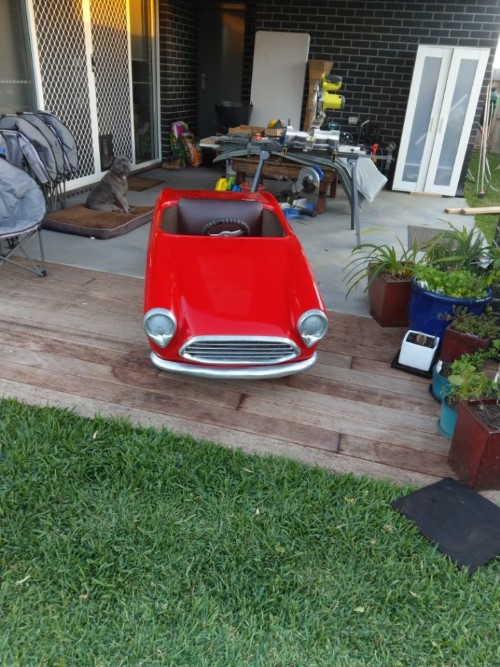 It’s a little fiberglass car that originally came off an old merry go round, it did have a 50cc whipper snipper engine, it’s soon too have a 300cc 17hp heart transplant