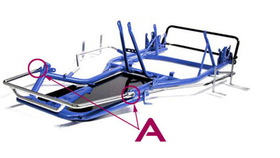 Re-install the top crash bar onto the kart – do not over-tighten the two bolts (A in the picture below) holding ito onto the tabs of frame.