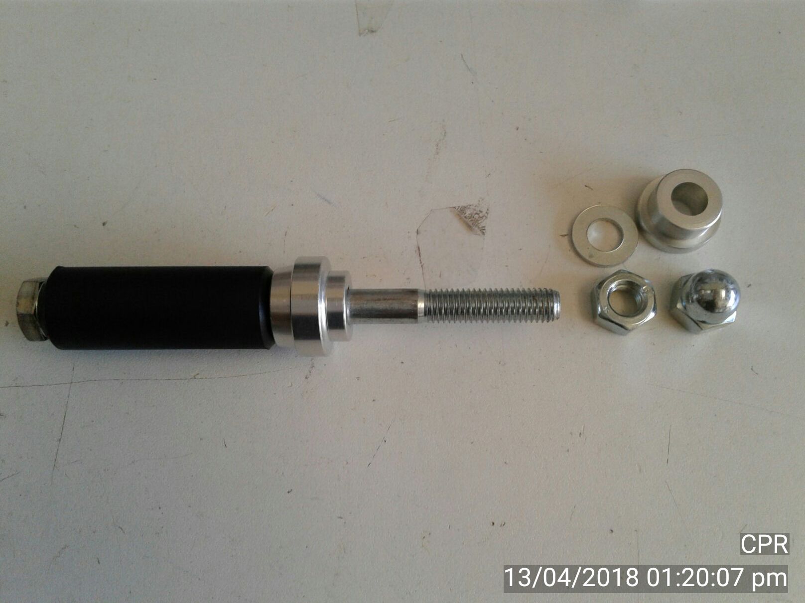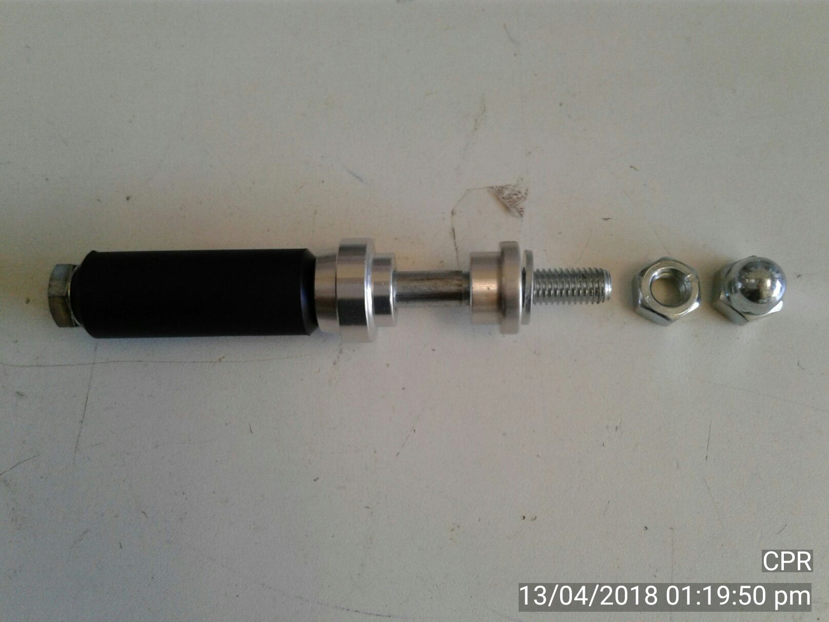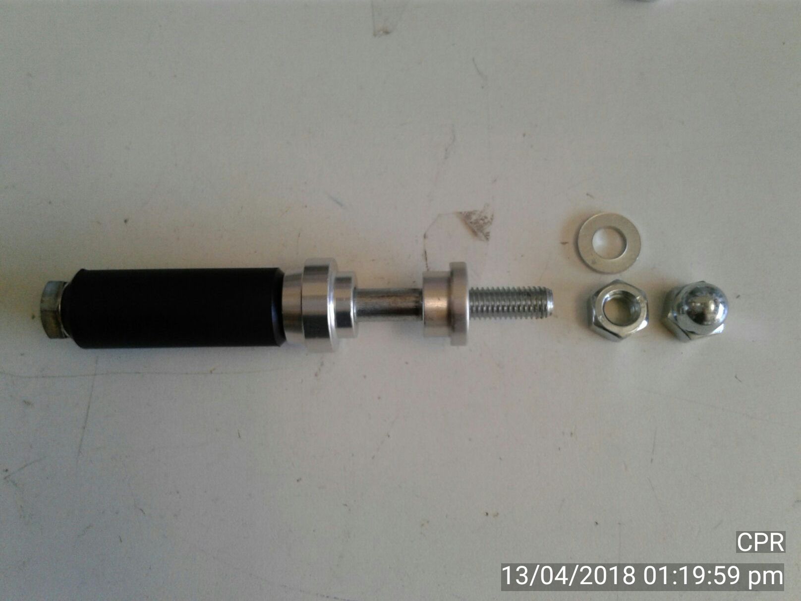 Slide the double sided aluminium bush over the bolt and down against the rubber insert, with the larger tapered flange first.