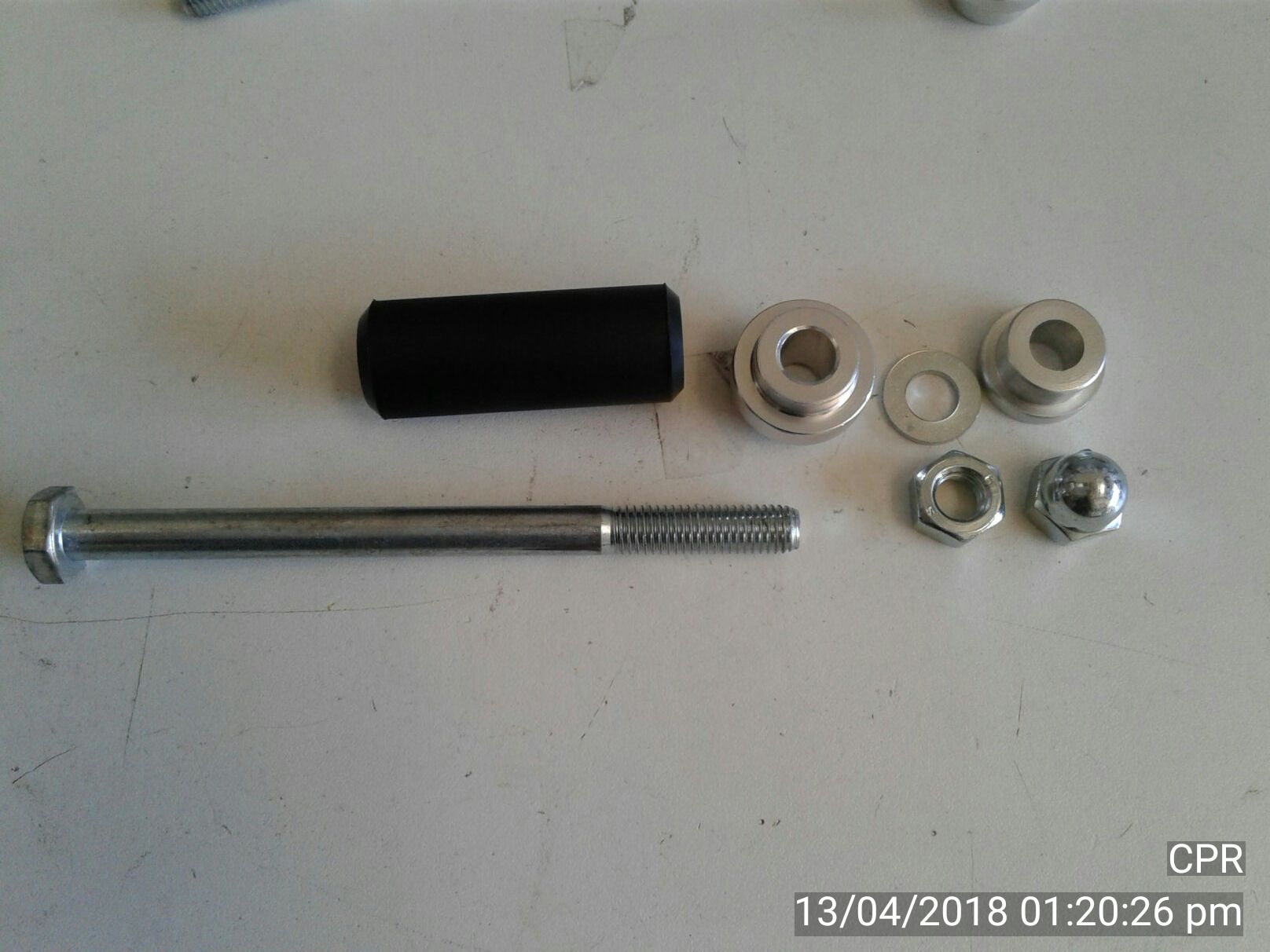 Fit your rear crash bar or if using a plastic bumper fit the bracket. This part is not shown, then slide the single sided aluminium bush over the bolt so that it keeps the tube from the crash bar or rear bumper mount in place.