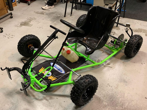 When you’ve got a vintage kart, like Kent Hardgrave and John Pye, you’ll need to find a way to get that direct drive motor spinning. Running along pushing by hand is certainly not enjoyable (or relatively safe) so if you’re looking for an authentic driving experience without the hassle of pushing and jumping in, Kent & John have found the perfect solution – a brillian push-kart, bult using CPR components including Axle and Wheels – how good does this thing look finished in bright green and black!
