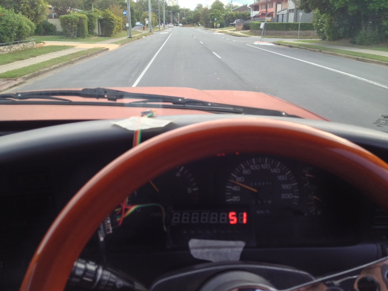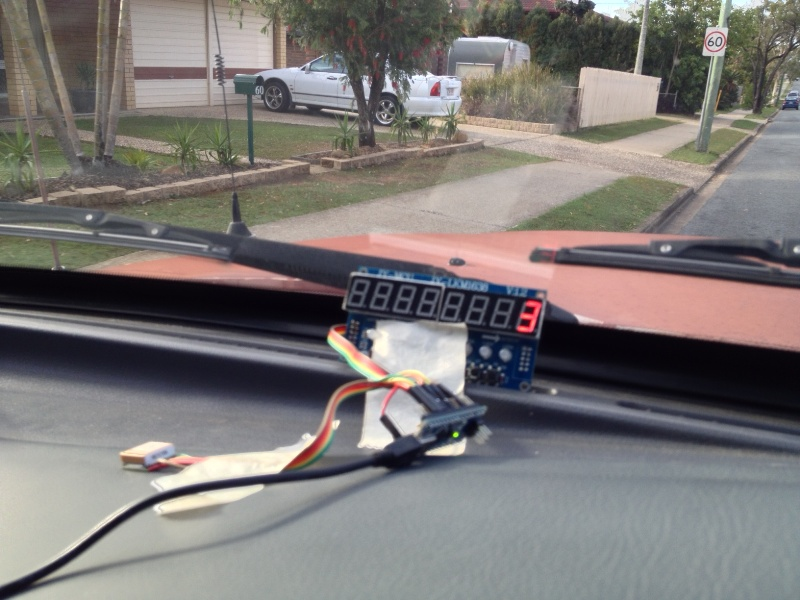 I was able to read the Velocity over ground from the GPS strings and display them as speed in kph on the 7seg display. Sitting at my desk wasn’t getting me much speed though so using a cigarette lighter USB adapter as a power source I sticky-taped the kit to the dash of my car and used it for a few trips to work and back, just testing and checking reliability of speed etc. It worked great!