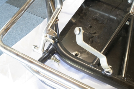 a. Fit the single short bracket to the front of the chassis at the central upright bracket close to the front rail. The curved bent section attaches to the chassis upright bracket and curves toward the rear of the kart.