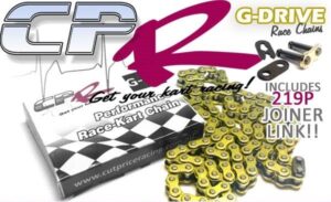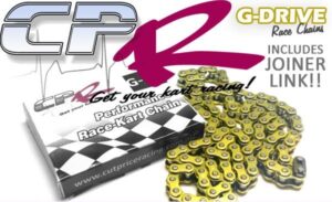 CPR G-Drive chain is a revolutionary new gold-link chain designed for optimum strength for racing while maintaining incredible convenience by employing the first race-grade joiner link available to kart racers globally.