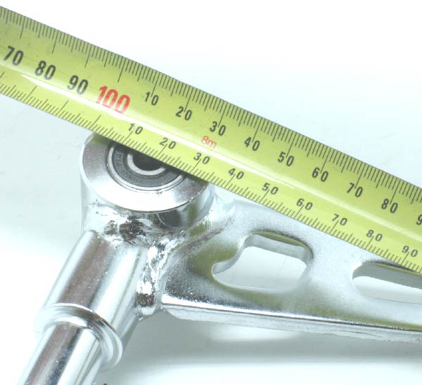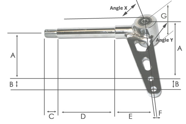 Angle between king pin and arm (not shown, as per picture orientation – stub is actually upside down) – 85 degrees / 95 degrees