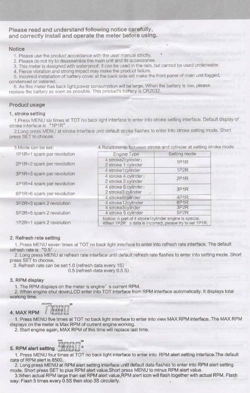 1x up to 20,000rpm TACHO with MAX-RPM Recall and Sensitivity/Display adjustment features