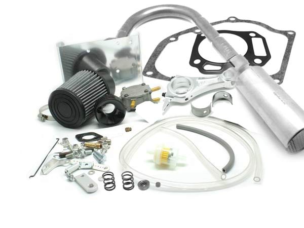 This kit replaces Air Intake system, upgrades the fuel system to an external tank and high flow fuel pump, upgrades exhaust system to racing specification and includes all springs and connectors necessary for a complete change-over. Also includes replacement billet connecting rod to ensure your engine does not seize at high rpm, as well as head gasket and side cover gasket for convenience. Includes 18lb valve springs to elimate valve float at higher rpm. Your engine will look and perform fantastic after this upgrade!