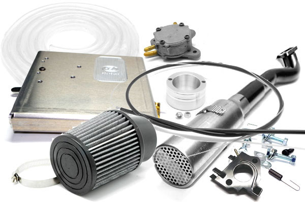 This kit replaces Air Intake system, upgrades the fuel system to an external tank and high flow fuel pump, upgrades exhaust system and includes all springs and connectors necessary for a complete change-over. Also includes polished aluminium professionally welded mount plate. Your engine will look fantastic after this upgrade!