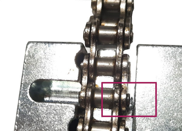 3. Insert the side of the chain with the chain pin hanging out the side of the plate into the tool, with the chain pin located in the slot in front of the Screw.