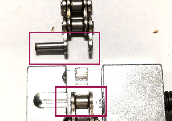 4. Insert the roller end of the chain (the other part to be joined) into the chain in the tool so the assembly is sitting into the rail.  Try to align the chain pin with the chain roller as well as you can.