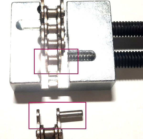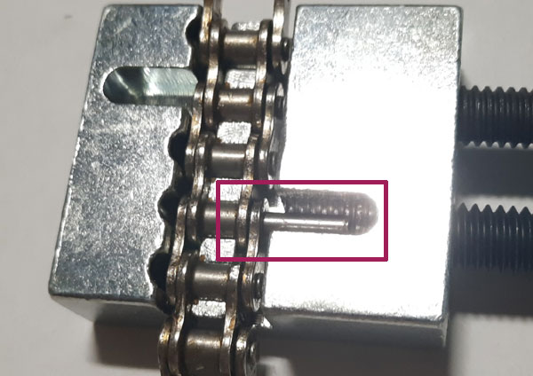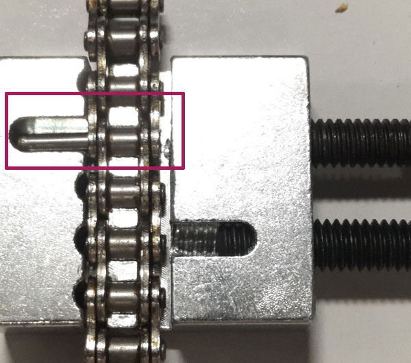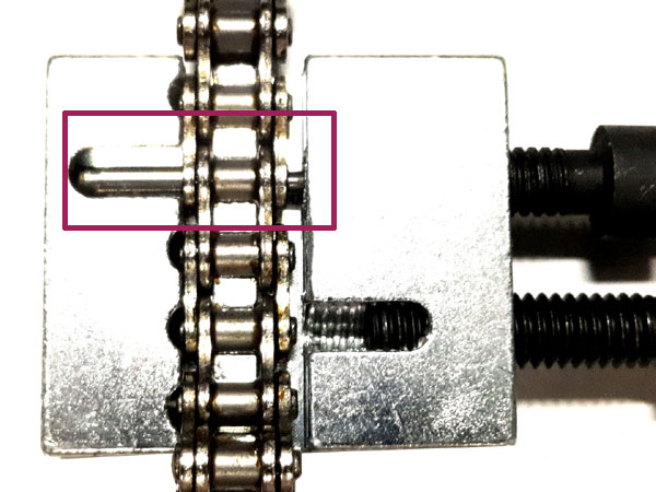 8. The chain pin should now push out with little force required.  If there is still reasonable force required, the pin on the Pin Screw is not properly centred.  Back it out and try again.