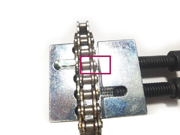 1. Place your chain in the breaker, with the chain pin you want to remove in-line with the Pin Screw. *TIP: Spray some lubricant/chain lube on the chain pin you’re going to remove to make the process easier and avoid damaging the inside of the roller.