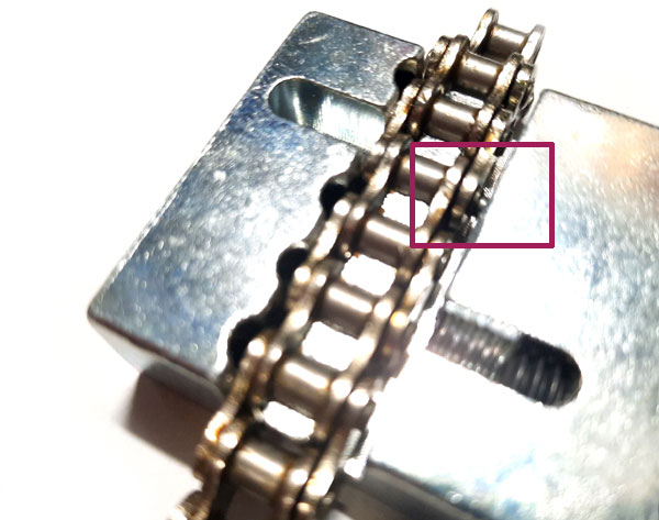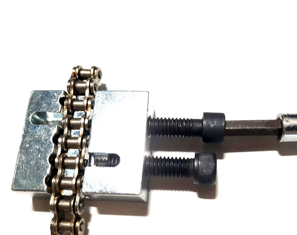 2. If the pin seems to require a lot of force to push in then there is a problem.  The plates and roller and pin are not aligning.  Sometimes it helps to giggle the chain while it is still in the tool, by backing off the Screw a touch to relieve pressure on the chain pin.